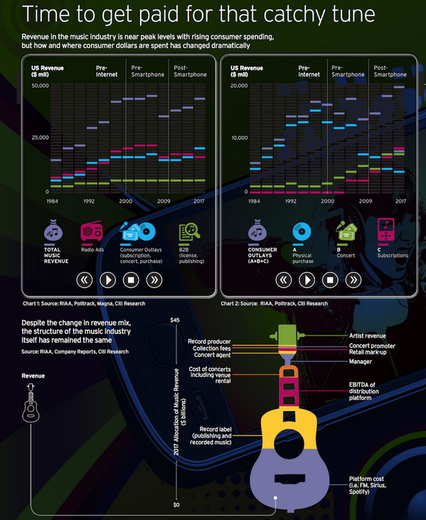 Музыканты являются самым низкооплачиваемым звеном в мировой музыкальной индустрии. Об этом свидетельствует доклад исследовательской компании Citygroup, опубликованный на Pitchfork. По их данным, суммарный доход всей музыкальной индустрии США в 2017 году составил 43 миллиарда долларов (этот год был самым удачным для бизнеса с 2008-го). Но непосредственно музыкантам досталось лишь 12% от этой суммы, то есть 5 миллиардов долларов. Остальные деньги ушли различным посредникам: радиостанциям, стриминговым сервисам, звукозаписывающим и концертным компаниям, издательствам и т.д.