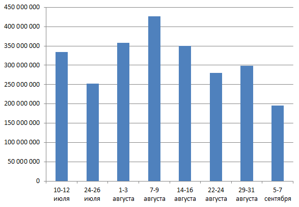 | 4 | 8 августа | 10.829.701 | 303.016.000 | 125.000.000 |