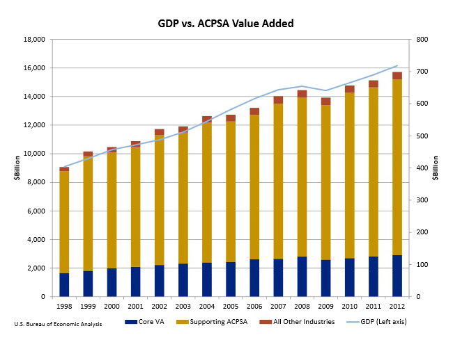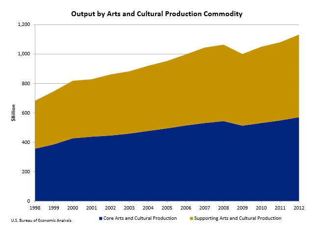 Анализ вспомогательного счета ACPSA (Arts and Cultural Production Satellite Account) показывает, что общий объем культурно-художественного производства в 2012 году составил более 1,1 трлн долларов. Объем культурного производства (сore ACP - исполнительское искусство, независимые артисты, писатели и художники, музыкальные промоутеры, музеи, реклама и т.д.) составила 571,1 млрд. долл. Поддерживающее производство (supporting ACP - издательства, кинопроизводство, звукозапись, теле- и радиовещание, производство музыкальных инструментов и т. д.) принесло 561,2 млрд. долл.