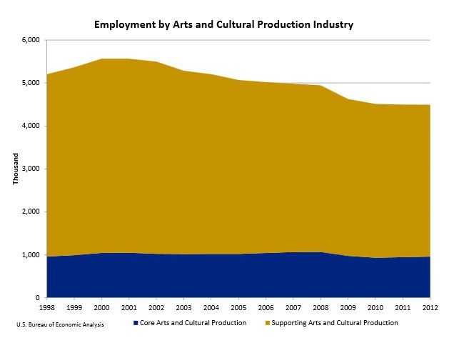 Бюро экономического анализа США (Bureau of Economic Analysis) опубликовало в январе 2015 года детальную статистику развития культурно-художественной индустрии (arts and cultural production, ACP). Опубликованные данные относятся к 2012 г. В соответствии с подсчетами, номинальная добавленная стоимость в этой сфере за год выросла на 3,8% - до 698,7 млрд долларов, что составило 4,3% валового внутреннего продукта США (немного меньше, чем строительство, но втрое больше сельского хозяйства). Все последние годы индустрия показывала аналогичные темпы роста - за исключением кризисного 2009 г., когда было зафиксировано падение более, чем на 3%; впрочем, в следующем году темпы роста заметно ускорились.