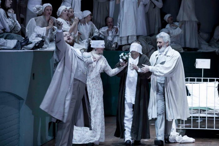 Так, всё действие оперы преподносятся в виде воспоминаний слабоумного Германа в исполнении Владимира Галузина. Лиза (Эвелина Добрачева) поет свои арии в изголовье больничной кровати, а призрак Графини (Лариса Дядькова) приходит к герою в образе лечащего врача. Вынужденные перестановки в сюжете отвлекают от главного — музыкальной составляющей.