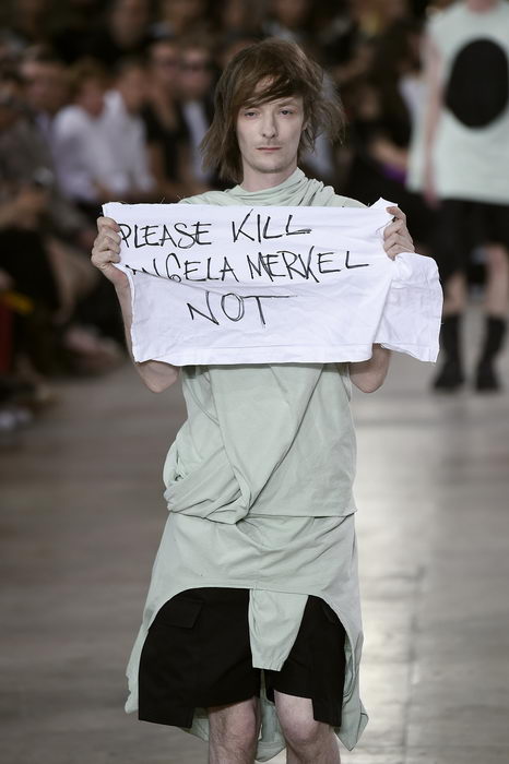 Когда манекенщик Джира на fashion-шоу Rick Owens весна/лето 2016 во время прохода по подиуму поднял над собой кусок ткани с надписью "Пожалуйста, убейте Ангелу Меркель - Нет", Рик Оуэнс был невероятно расстроен и только теперь решил высказаться по поводу инцидента и ярости, которую он обрушил на модель.