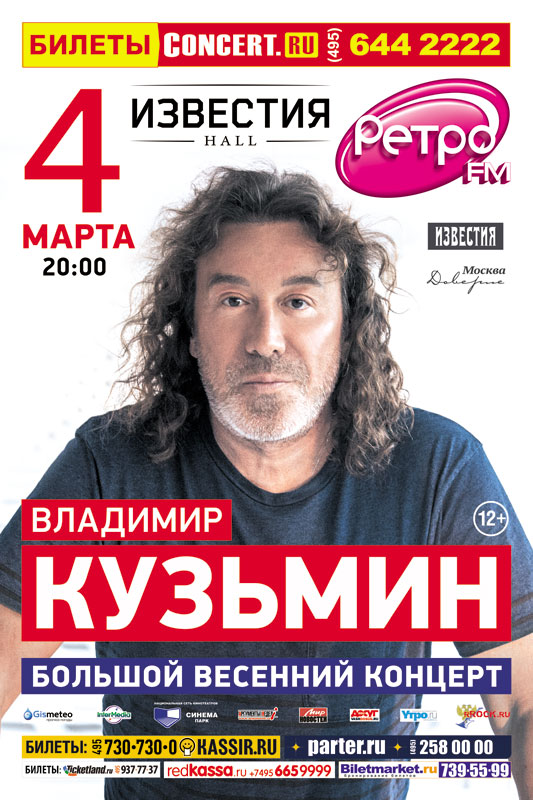 Владимир Кузьмин выступит с программой «Большой весенний концерт! Лучшие песни!» в «Известия Hall» 4 марта 2016 года.