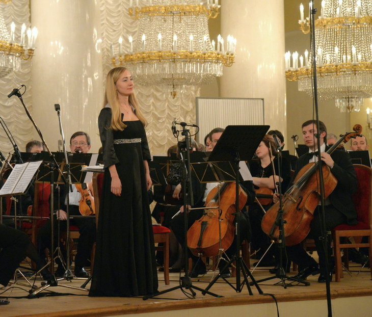 Симфонический оркестр радио «Орфей» и солистка Академического Большого хора «Мастера хорового пения» Татьяна Минеева во время исполнения каватины Нормы из первого акта оперы «Норма» В.Беллини во втором отделении концерта «Территория радио»