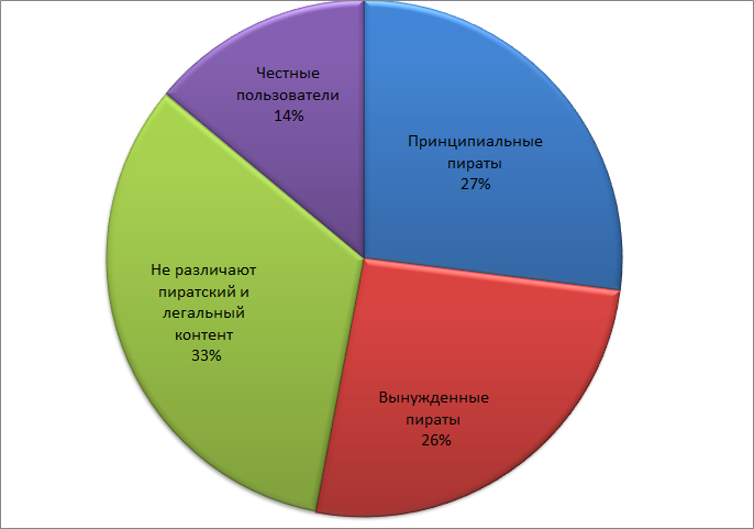 Оказалось, что более четверти опрошенных (27%) пользуются пиратскими сервисами из принципиальных соображений, считая, что в интернете все должно распространяться бесплатно. Всего 14% – честные пользователи, предпочитающие покупать лицензионный контент. Более четверти пользователей (26%) покупают ПО и игры, но музыку и кино часто потребляют незаконно, оправдываясь небольшим количеством легальных сервисов и неполным ассортиментом предлагаемого ими контента. Около трети (33%) просто не отличаются особой технической и юридической грамотностью, а потому используют любой доступный контент. Таким образом, можно говорить о том, что 86% пользователей Рунета считают потребление пиратского контента вполне приемлемым или даже правильным.