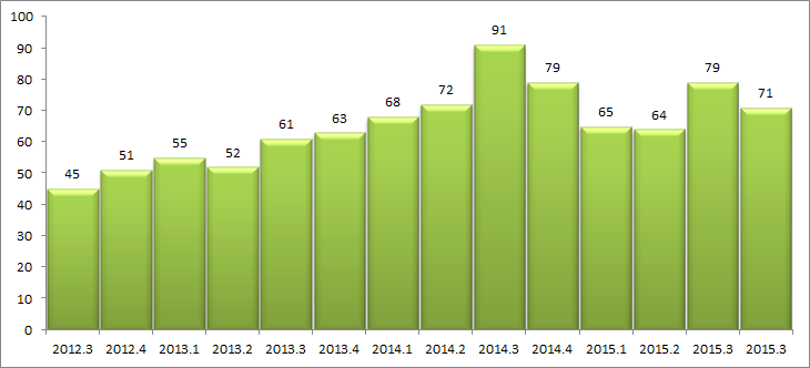Доля успешных обращений РАПО по удалению контента также выросла. С 45% в конце 2012 г. она поднялась до 71% к концу 2015 г.