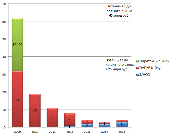 В докладе «Масштабы видеопиратства в России и потенциальный эффект от его снижения», подготовленном международной аудиторско-консалтинговой компанией EY (ранее известной как Ernst & Young) для форума Russian Interactive Week 2016 в Москве, приведены данные о росте объёма легальных продаж домашнего видео в США с 2010 по 2015 гг. с 19 до 21 млрд. долл. (включая физические носители и цифровые сервисы). Для России по данным EY этот показатель в лучший год (2009) составлял около 32 млрд руб. (около 1 млрд долл.), после чего началось обвальное падение до 4 млрд руб. в 2015 г. (около 66 млн долл.). Таким образом, за 7 лет обороты домашнего видео в России сократились на 88%.
