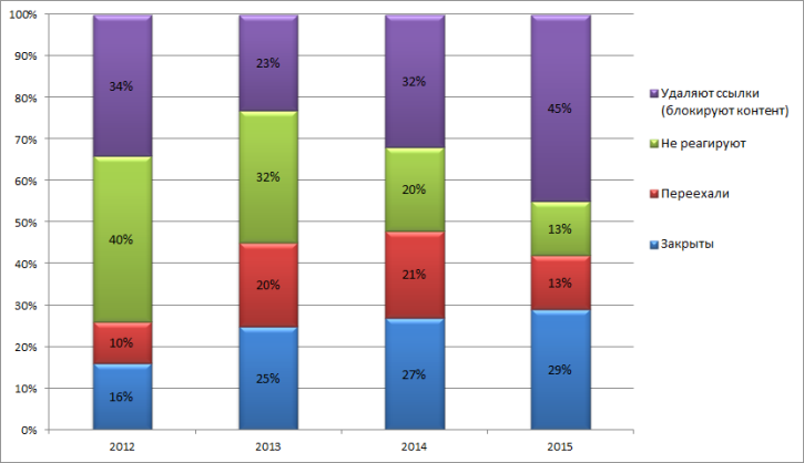 Таким образом, за 2015 г. положительные для правообладателей реакции (удаление ссылок, блокировка контента и закрытие сайтов) составляют уже 74% от всех реакций хостинг-провайдеров.
