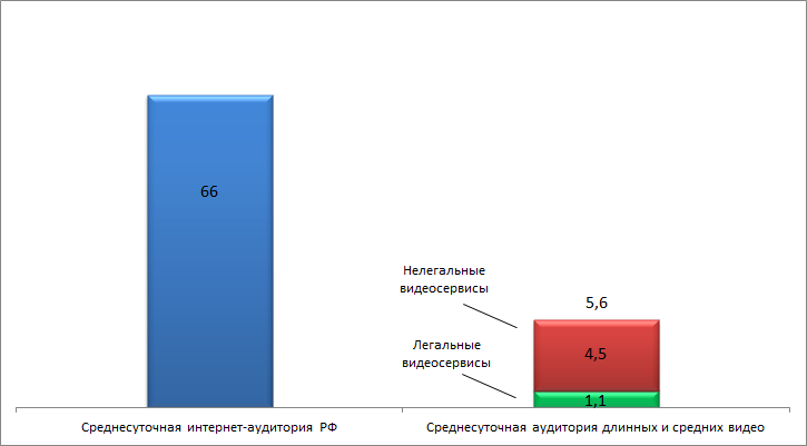 Доклад EY обращает внимание на то, что аудитория пиратских ресурсов вчетверо превышает аудиторию легальных видеосервисов - лишь каждый пятый пользователь смотрит легальный контент. Общая аудитория длинных и средних видео (фильмы и сериалы) в интернете составила, по оценке EY, 5,6 млн человек в сутки, и лишь чуть больше 1 млн из них пользуется легальными видеосервисами. 4,5 млн пользователей постоянно потребляют пиратский контент.