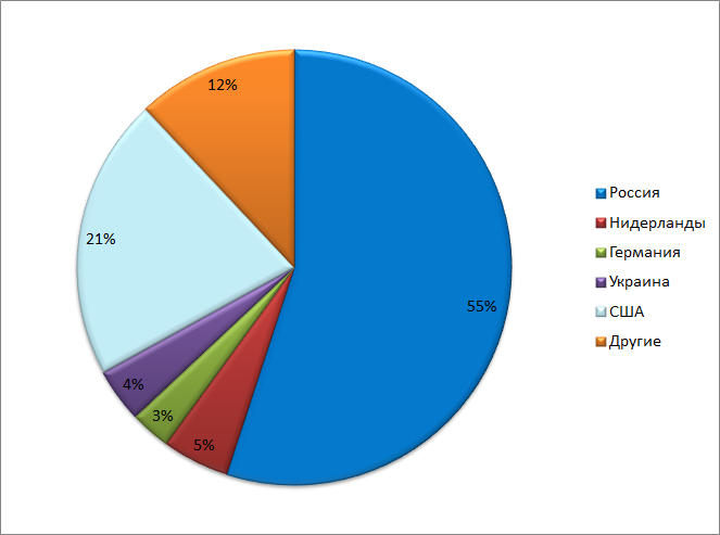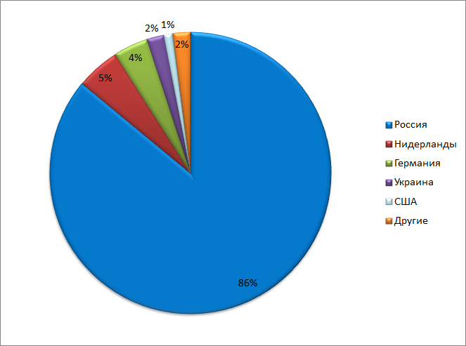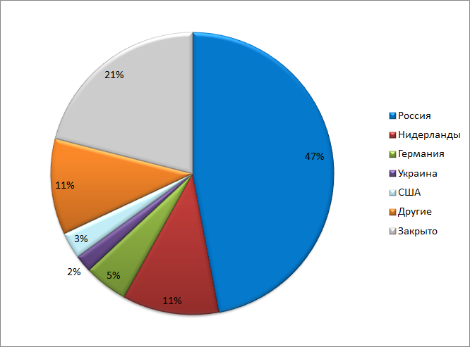 В 2013 г. пиратские сайты размещались в основном в России, и лишь 14% – за рубежом (в основном, в Германии и Нидерландах). С 2014 г. ситуация начала меняться. Почти половина пиратских сайтов за два года успела переехать за рубеж, чтобы работать на территории России оттуда. В 2015 г. значительно выросла доля сайтов, работающих из США (21%), Нидерландов (5%) и Украины (4%).