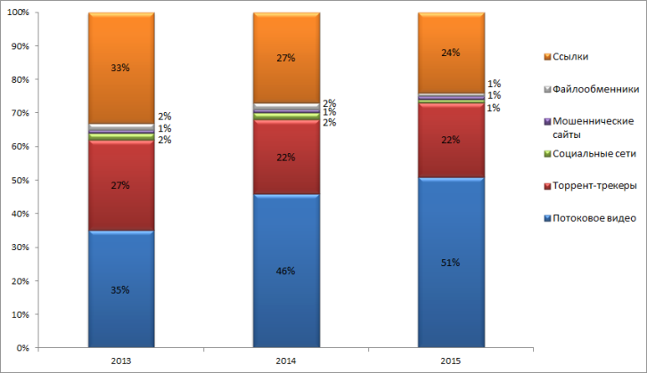 Распределение сайтов с пиратским контентом по типам, 2013–2015 гг.
