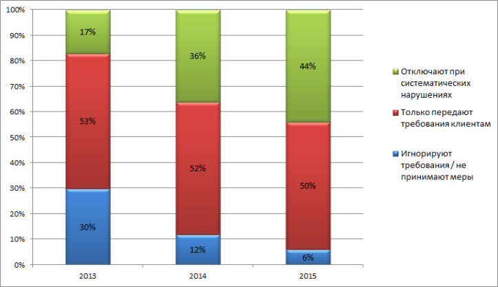 С принятием закона хостинг-провайдеры стали оперативнее реагировать на требования правообладателей. Если в 2013 г. лишь по итогам 17% обращений нарушителей блокировали, то в 2015 г. доля таковых достигла уже 44%. В то же время все реже требования игнорируются: с 30% в 2013 г. их доля сократилась до 6% в 2015 г.