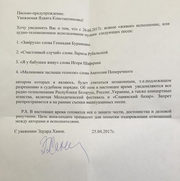 - Хочу уведомить Вас о том, что в связи с грубейшими нарушениями моих авторских прав и предстоящими судебными разбирательствами с Анатолием Ярмоленко и дуэтом Тихановича-Поплавской я как обладатель исключительных прав известил все радио и телеканалы Республики Беларусь о запрещении с 26 апреля 2017 года использования как в аудио, так и в телевизионном вариантах музыки следующих моих сочинений (песен):
