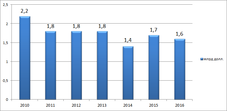 Сборы фильмов в формате 3D в кинотеатрах США, 2010–2016 гг., млрд долл.