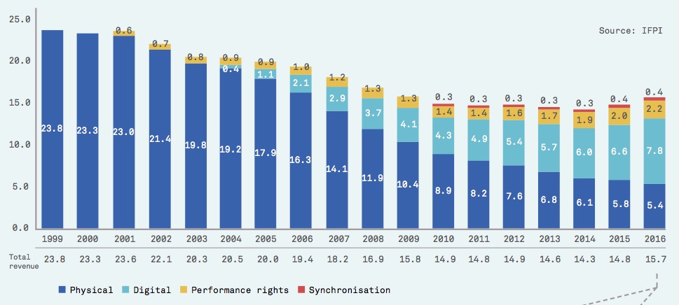 Мировая индустрия звукозаписи, 1999–2016, млрд долл.