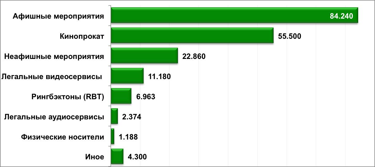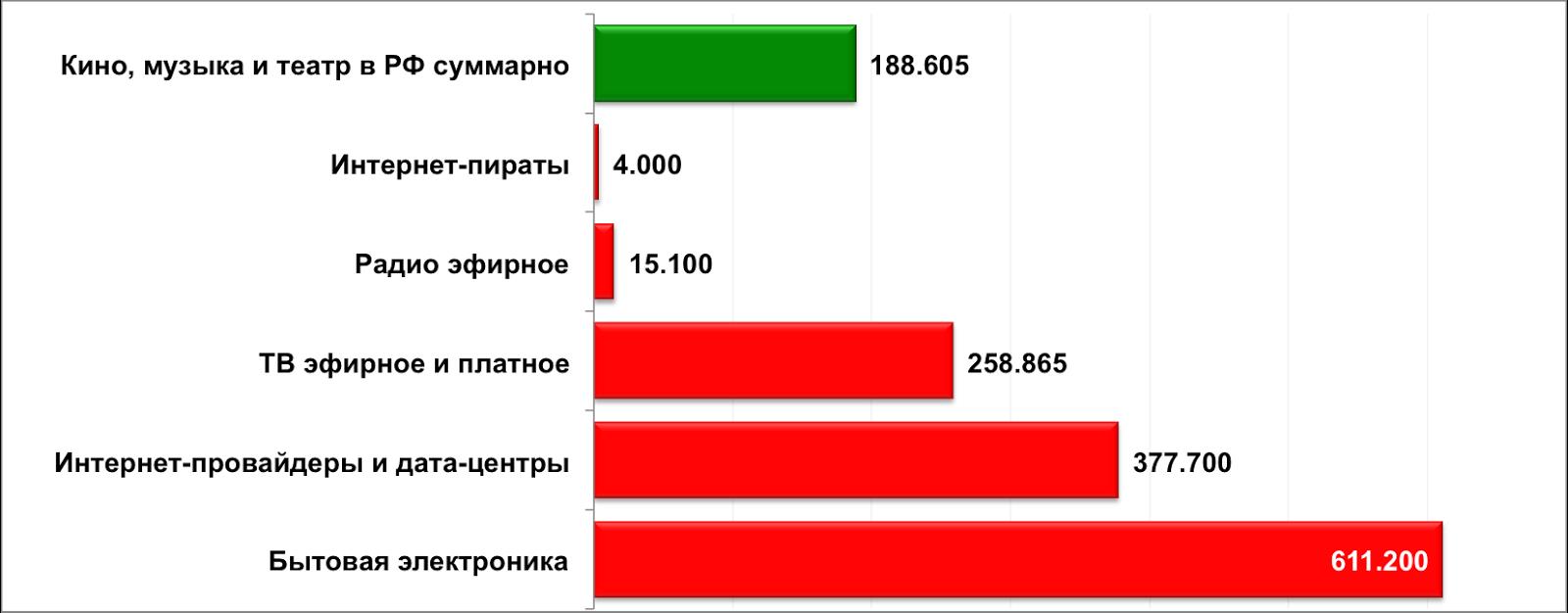 В диаграмме ниже приведена предварительная оценка суммарных доходов традиционной индустрии кино, музыки и театра в сравнении с высокотехнологическими отраслями, эксплуатирующими творческий контент. Данные по эксплуатирующим отраслям приведены в полном объёме (ранее учитывались только доходы, связанные с музыкой, кино и театром). В данной системе расчёта не учитывалось инвестирование и кредитование.