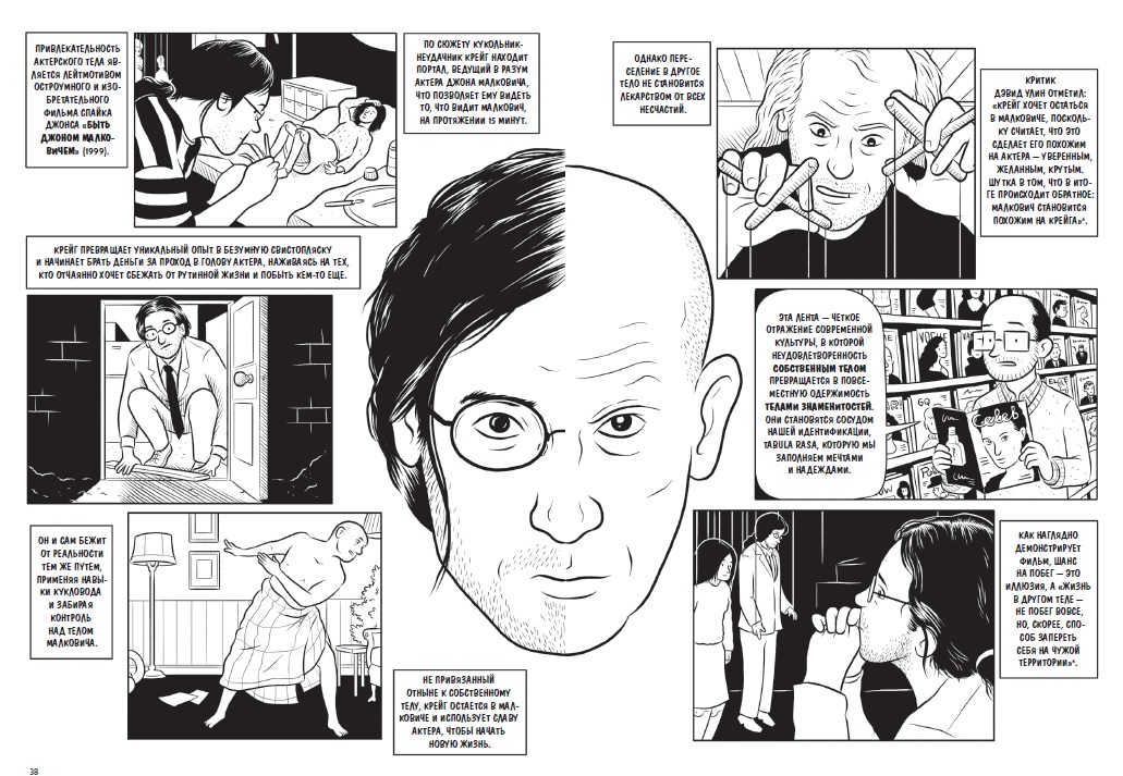 Особенно удачно тут то, что эта книга – комикс, хоть она и выпущена издательством, которое специализируется на литературе по саморазвитию и бизнесу. Визуальный язык комикса близок к кинематографическому языку. Это делает возможным использование на всех страницах бесконечного числа отсылок к шедеврам кинематографа. В результате книга, с одной стороны, охватывает большой промежуток времени – от первых фильмов братьев Люмьер, немецкого экспрессионизма и фильмов Тарковского до блокбастеров вроде «Звездных войн», «Матрицы» и бондианы. С другой стороны, она доносит вполне серьезную информацию до максимально широкого круга читателей и не выглядит при этом излишне заумно.