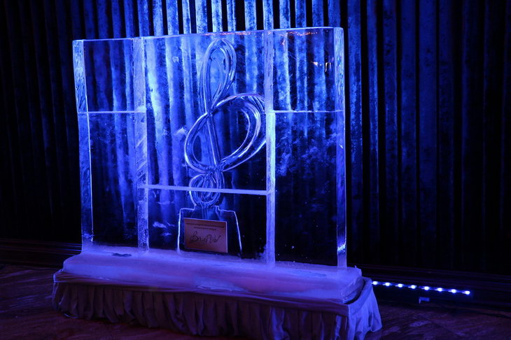 В фойе звезды общались с журналистами и фотографировались на фоне пресс-вола. Холл украшала ледяная скульптура с логотипом премии, а рядом с ней располагались бары с устрицами и шампанским.