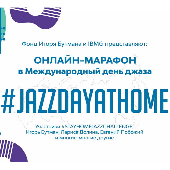Онлайн-марафон «JazzDayAtHome» состоится 30 апреля 2020 года в Международный день джаза. В этот день зрителей ждет большой онлайн-концерт с участием Игоря Бутмана, Ларисы Долиной, Евгения Побожего и других известных отечественных джазменов. В программе будут также выступать Антон Баронин, Mike Lisov и Woo Funk, Эстрадно-джазовый оркестр им. Кима Назаретова, Трио Адама Терацуяна, One Night Band, Mussorgsky Jazz Orchestra, Квартет Дмитрия Семенищева, группа Planck'stone, Макс Дорбеко и KosmaxBand, группа Easy Winners, Квинтет Максима Дурова (DMQ), Квинтет Николая Ольшанского, Трио Виктора Чаплыгина и др. Кроме того зрителей ждут номера в исполнении участников конкурса «Stay Home Jazz Challenge» из восьми регионов нашей страны, сообщили агентству InterMedia в пресс-службе фонда Игоря Бутмана, выступающего одним из организаторов марафона вместе с продюсерским центром IBMG и телеканалом «Москва24».