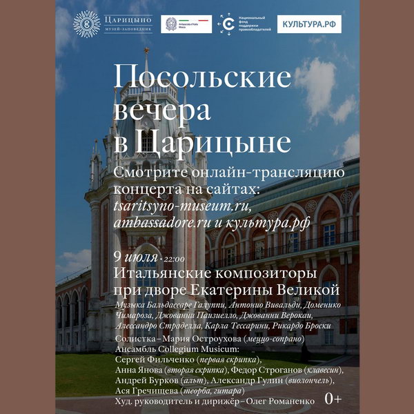 Онлайн-трансляция концерта «Итальянские композиторы при дворе Екатерины Великой» в рамках проекта «Посольские вечера в Царицыне» состоится 9 июля 2020 года. Мероприятие на Дворцовой площади музея-заповедника «Царицыно», посвященное культуре Италии, организовано музеем-заповедником «Царицыно» и Национальным фондом поддержки правообладателей при содействии Посольства Италии в России.
