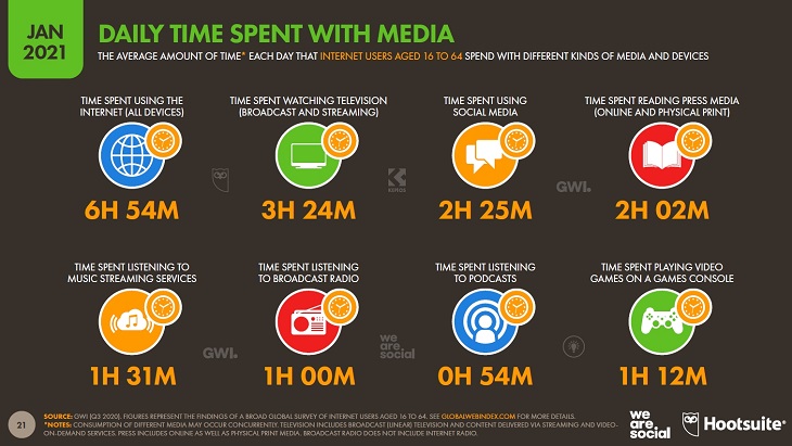 В среднем люди по всему миру тратят 3 ч. 24 мин. в день на просмотр телевизионного контента (как телеканалов, так и стриминговых сервисов), 2 ч. 25 мин. – на общение в социальных сетях, 2 ч. 2 мин. – на чтение, 1 ч. 31 мин. – на прослушивание музыки в стриминговых сервисах, 1 ч. 12 мин. – на видеоигры, 1 ч. – на радио, 54 мин. – на подкасты.