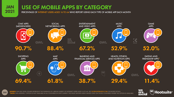 Также WeAreSocial и Hootsuite проанализировали популярность мобильных приложений. У аудитории 16–64 лет самыми популярными оказались чаты и мессенджеры – они установлены у 90,7% пользователей смартфонов, еще 88,4% имеют приложения для социальных сетей. 69,4% используют приложения для покупок, 61,8% – карты и навигаторы, 38,7% – приложения для работы с личными финансами, 29,4% – приложения для контроля за здоровьем, 11,4% – приложения для знакомств. Что касается потребления контента и развлечений, то 67,2% используют приложения для просмотра видео, 52,9% – для музыкального стриминга, а 52% – мобильные игры.