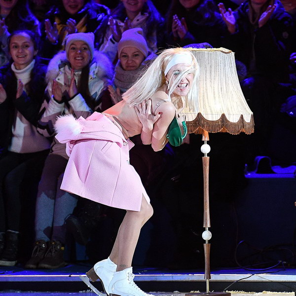 Дарья Мельникова и Максим Маринин выступили со светящимися воздушными шарами, а Оксана Домнина и Кирилл Зайцев катались под «Калинку» в одном коньке. У Дани Милохина и Жени Медведевой было радостное новогоднее выступление под песню «Happy New Year» группы ABBA, а Агата Муцениеце (на фото) сыграла соблазнительную стриптизершу. Ксения Бородина и Дмитрий Соловьев разыграли на льду триллер: она опоила его зельем и превратила в зомби.