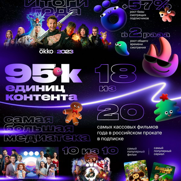 Онлайн-кинотеатр Okko подвел итоги уходящего года. Больше всего новых пользователей привлекли оригинальные проекты Okko – «Волшебный участок», «Открытый брак», «Предпоследняя инстанция» и «Манюня». Фильмом, который привлёк больше всего новых пользователей, а также самой популярной полнометражной картиной в Okko в 2023 году вообще, стал «Чебурашка». В десятку фильмов с наибольшим числом зрителей вошли «Кентавр» и «Жанна Дюбарри», а также и громкие премьеры онлайн-кинотеатра, такие как «Вызов» и «Джон Уик 4».