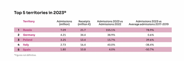 Россия оказалась основным рынком для французских фильмов в 2023 году (несмотря на эмбарго на продажу российским компаниям, поддерживаемое правительством из-за ситуации на Украине). Французские фильмы, выпущенные в России в 2023 году, собрали 21,7 млн евро при 7,09 млн просмотров, что на 155,1% больше, чем в 2022 году. На фильм «Леди Баг и Супер-Кот: Пробуждение силы» было продано 3,53 млн билетов в России, а также наша страна стала крупнейшим международным рынком для «Жанны Дюбарри»: ее посмотрели 1,06 миллиона российских зрителей.