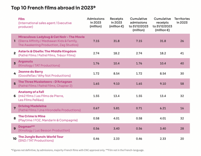Самым большим спросом у зарубежных покупателей впервые пользовалась французская анимация. Возглавила топ-5 самых популярных картин анимационная лента «Леди Баг и Супер-Кот: Пробуждение силы» (7,5 миллионов евро), за ней следуют комедия «Астерикс и Обеликс: Поднебесная» (2,74 млн), еще один полнометражный мультфильм «Аргонавты» (1,76 млн), историческая драма «Жанна Дюбарри» (1,72) и масштабный приключенческий фильм «Три мушкетера: Д’Артаньян» (1,65) – первая часть новой экранизации бессмертного романа Александра Дюма.