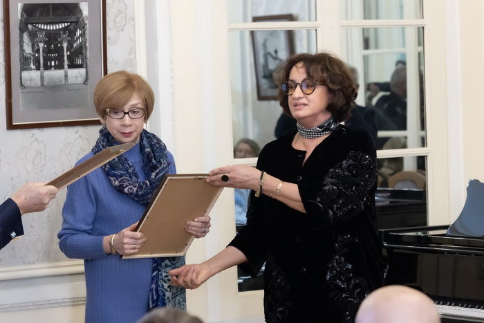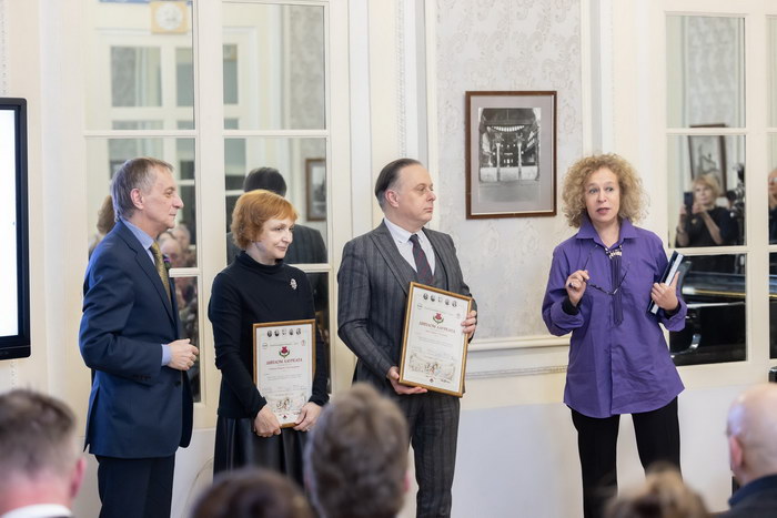 Член экспертного совета премии «Театральный роман» Марина Токарева вручила диплом лауреата редактору книги «Война и мир» Римаса Туминаса. Рождение спектакля»Елене Дунаевой. По ее словам, издание полностью опровергает превратное понимание режиссуры спектакля как инструмента и представляет ее как важнейшую составляющую обучающего процесса.