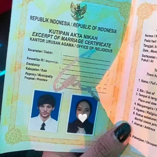 Документ представляет собой копию свидетельства о браке Республики Индонезия, в нем есть фотографии лиц девушки и Луи, расположенные рядом, а также его подпись. «Новобрачная» поделилась новостью и фотографией в соцсетях, уточнив, что Томлинсон сначала спросил, «законно ли это», а затем в конце концов согласился оставить автограф. Она даже утверждает, что кто-то из друзей спросил Луи, останется ли он теперь жить в Джакарте, на что Томлинсон пошутил: «Если моя жена захочет».