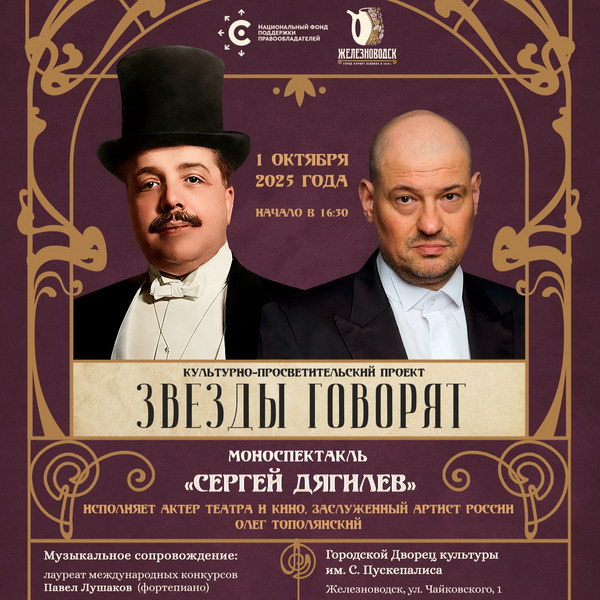 Творческий вечер из цикла «Звезды говорят» – культурно-просветительского проекта Национального фонда поддержки правообладателей – состоится 1 октября 2025 года в городе Железноводске Ставропольского края. Актер театра и кино, режиссер и педагог, заслуженный артист России Олег Тополянский выступит с рассказом о знаменитом театральном и художественном деятеле Сергее Дягилеве.